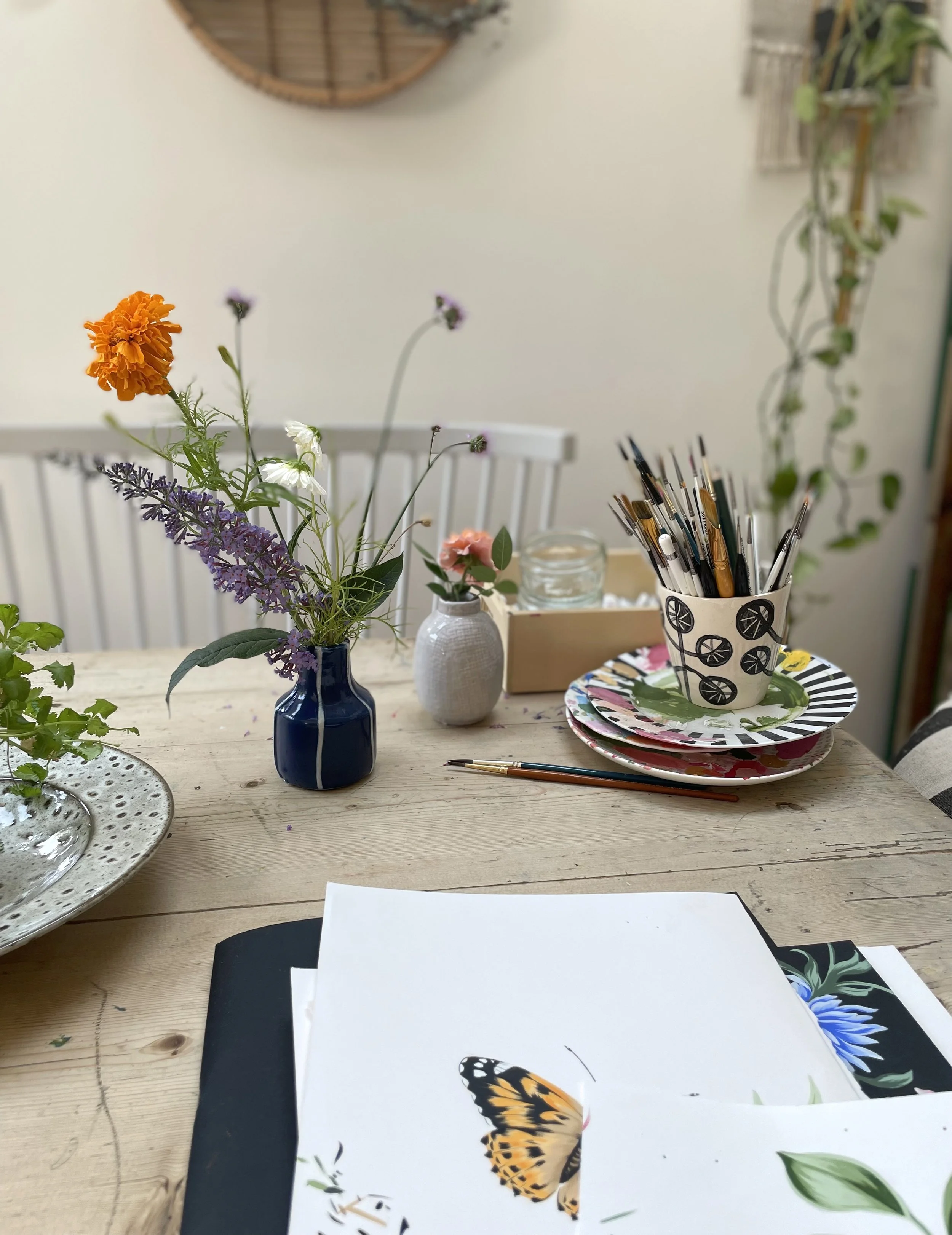 I am a print designer and painter based in London. I enjoy working mostly with gouache to hand paint my designs with lots of love and attention to detail. I was fortunate to study a Fashion Print degree at Central Saint Martins in London. From there I worked as an in-house print designer for many years at various brands for predominantly womenswear. Having been freelance now for a few years I have also worked on a variety of exciting Home projects.